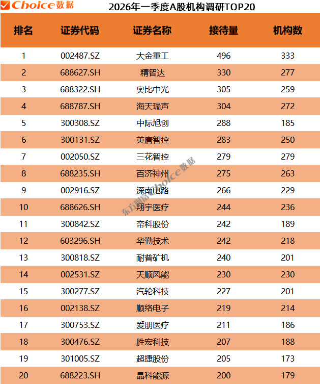 一季度,大金重工荣登机构“调研冠军”宝座,机构调研总量496次,共333家机构参与调研;精智达、奥比中光、海天瑞声获机构调研总量超过300次。