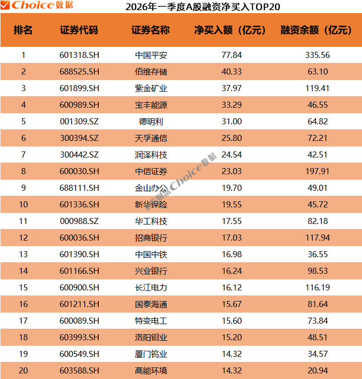截至3月30日,一季度共33只个股获融资资金净买入超10亿元,中国平安以77.84亿元的净买入额排名榜首,佰维存储、紫金矿业排名第二、第三,分别净买入40.33亿元、37.97亿元。