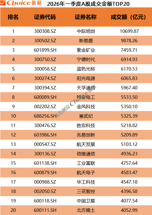 一季度,A股成交金额最大的个股是中际旭创,累计成交超1万亿元,新易盛位居次席,成交9878.26亿元,紫金矿业、宁德时代、阳光电源、天孚通信、寒武纪、特变电工等成交金额超5000亿元。