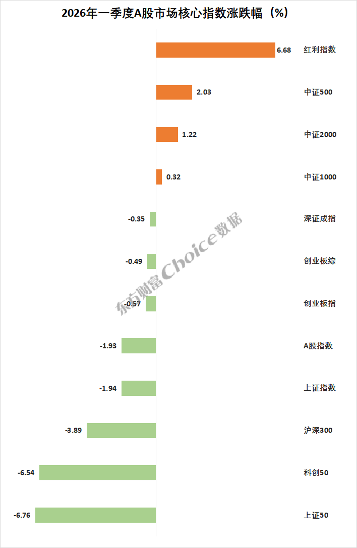 A股市场核心指数方面,红利指数一季度大涨6.68%,涨幅领先,中证500上涨2.03%,中证1000上涨0.32%,A股指数下跌1.93%,沪深300下跌3.89%,上证50、科创50跌超6%。