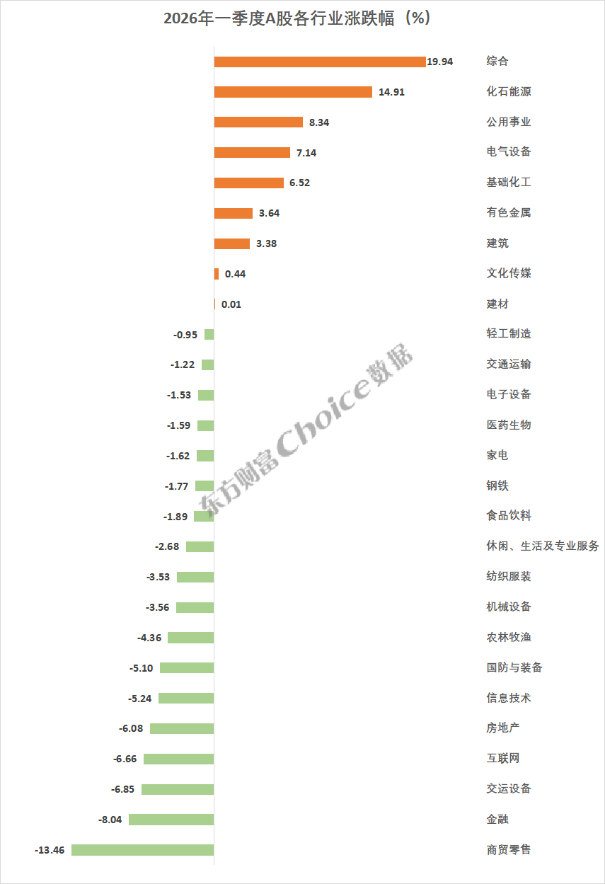 一季度,东财一级行业指数涨少跌多,综合行业以19.94%的涨幅排名第一;化石能源上涨14.91%,位居第二;公用事业、电气设备、基础化工涨幅超过6%;有色金属上涨3.64%。跌幅榜上,商贸零售居首,跌幅达到13.46%,金融、互联网、房地产等跌超6%。