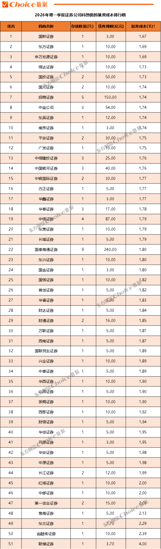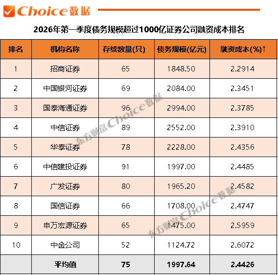 2026年第一季度证券公司融资成本排行总榜