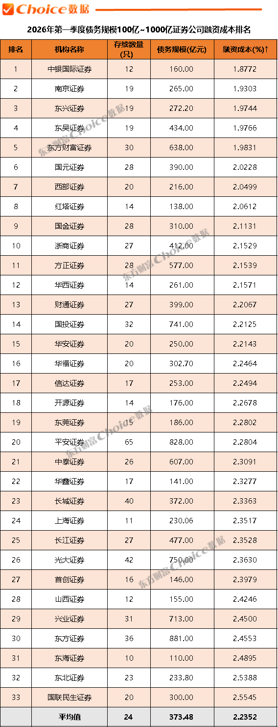 据Choice数据统计,截至2026年3月31日,在债务规模100亿至1000亿区间内共有33家券商,平均融资成本为2.2352%,较去年四季度进一步下降。中银国际证券、南京证券、东兴证券包揽前三,融资成本均低于1.98%,展现出在该规模区间内强劲的成本竞争力。