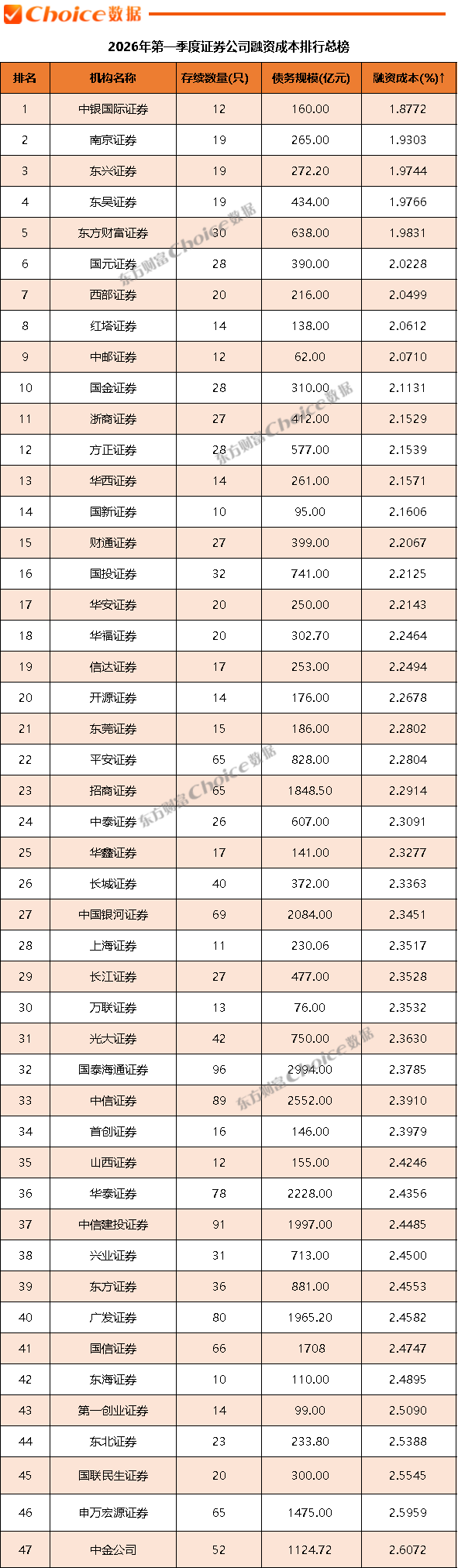 据Choice数据统计,截至2026年3月31日,在47家纳入统计的券商中,中银国际证券以1.8772%的融资成本位列第一,南京证券、东兴证券分别以1.9303%和1.9744%位居二、三位。