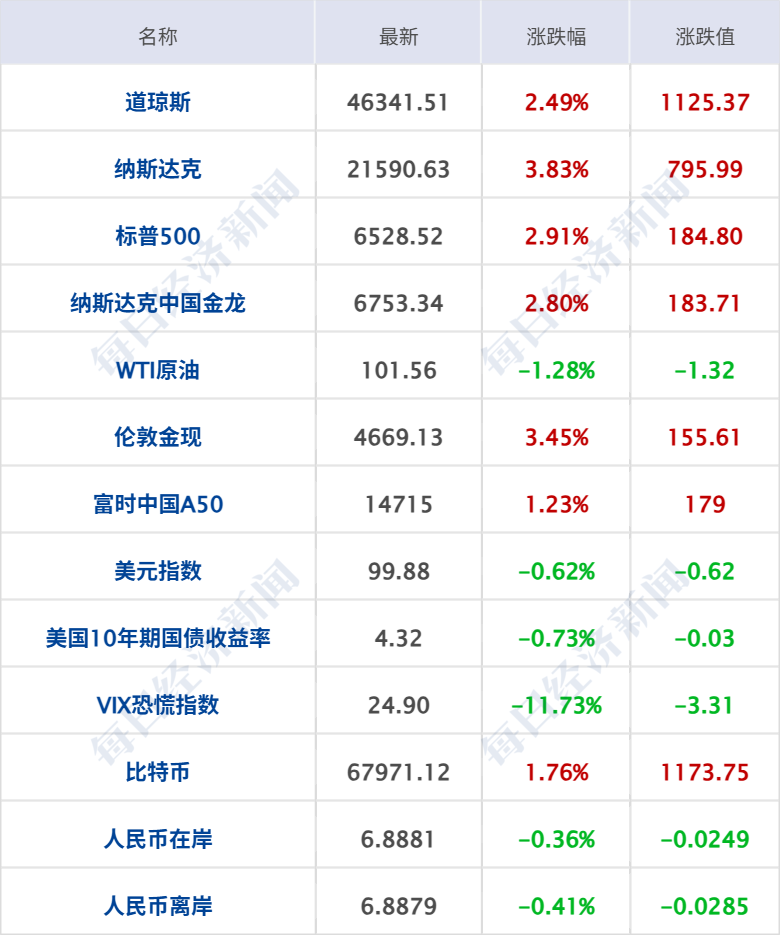 美股三大指数大幅收涨,纳指涨3.83%,标普500指数涨2.91%并创去年5月以来最佳单日表现,道指涨1125点,涨幅2.49%;月线方面,纳指本月仍累计下跌4.75%,标普500指数累跌5.09%,道指累跌5.38%;科技股反弹,闪迪涨超10%,西部数据涨超7%,英特尔涨超7%,甲骨文涨6%,英伟达、博通、谷歌涨超5%。中概股普遍上涨,纳斯达克中国金龙指数涨2.8%,蔚来涨逾9%,禾赛科技涨近8%,爱奇艺涨超6%,世纪互联涨逾5%,唯品会跌超1%。