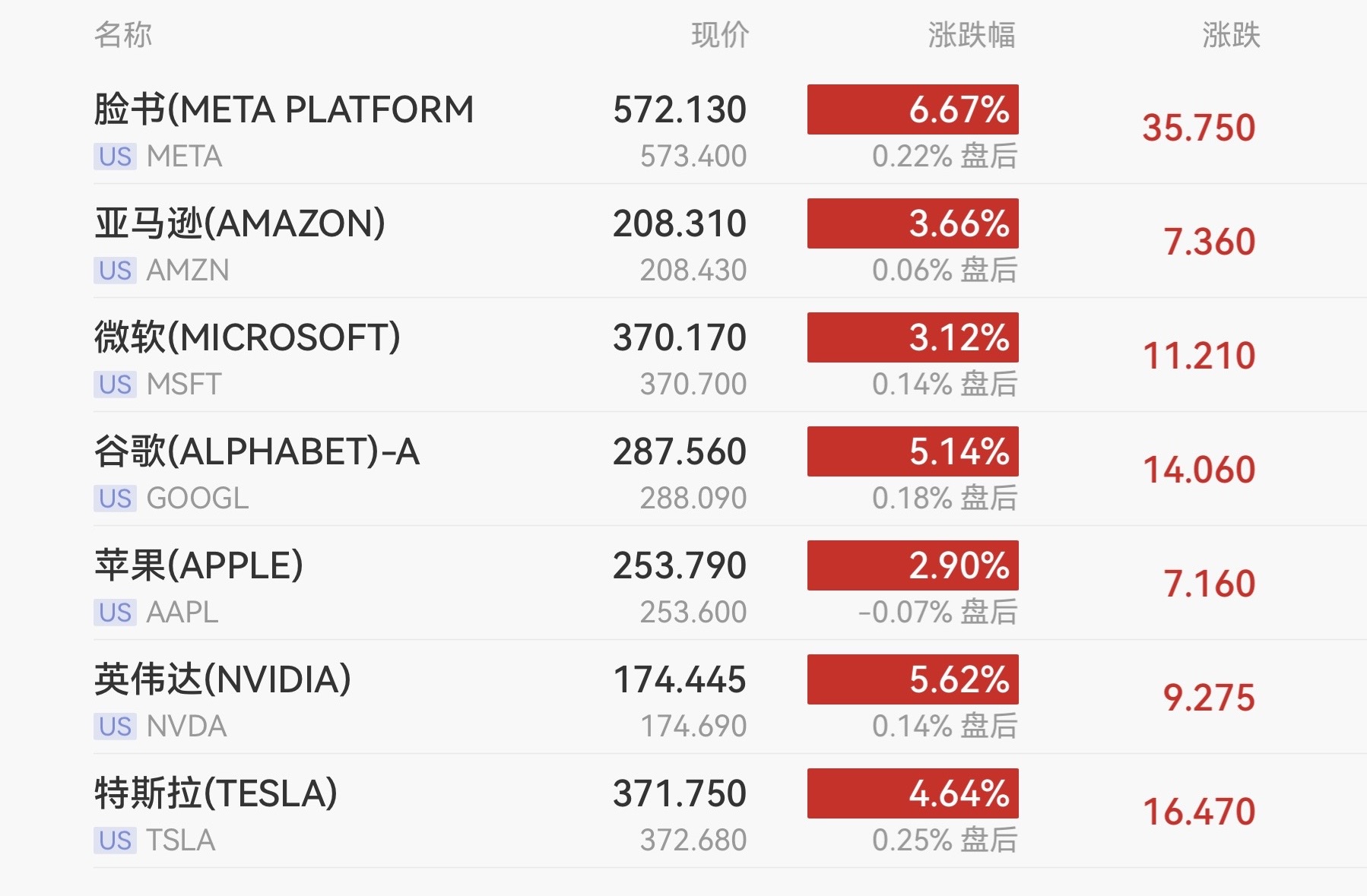 明星科技股全线走强,Meta收涨6.67%,英伟达涨5.62%,谷歌涨5.14%,特斯拉涨4.64%,亚马逊涨3.66%,微软涨3.12%,苹果涨2.90%。