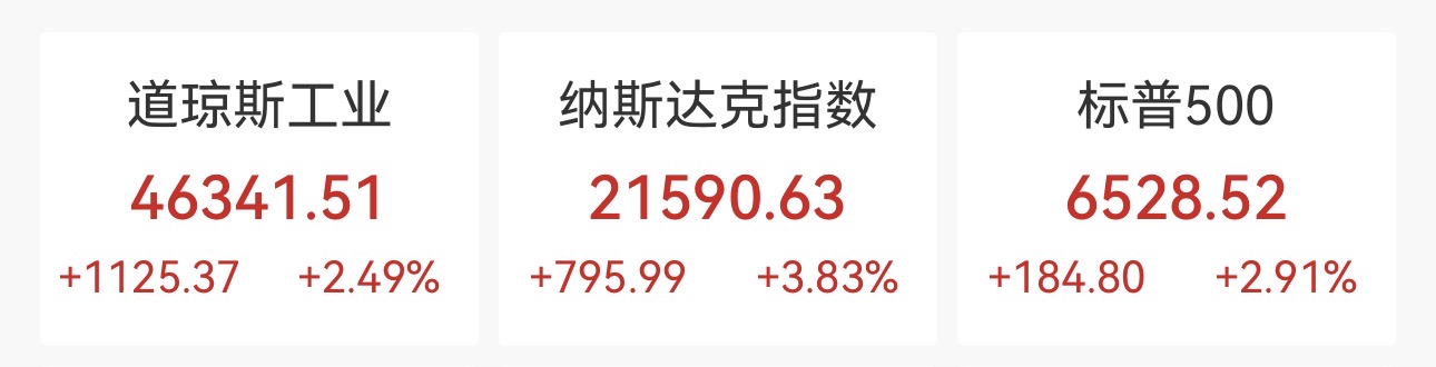受中东局势出现降温迹象提振,美股周二集体大幅收高,三大指数均创下自去年5月以来的最大单日涨幅。截至收盘,道琼斯工业平均指数涨1125.37点,涨幅2.49%,收于46341.51点。纳指涨795.99点,涨幅3.83%,收于21590.63点。标普500指数涨184.80点,涨幅2.91%,收于6528.52点。