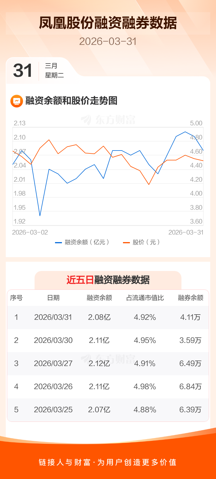 交易所最新数据显示,凤凰股份于2026年3月31日获融资买入391.43万元,融资偿还668.03万元,当日融资净偿还276.6万元。目前,该股融资余额2.08亿,占流通市值比例为4.92%。