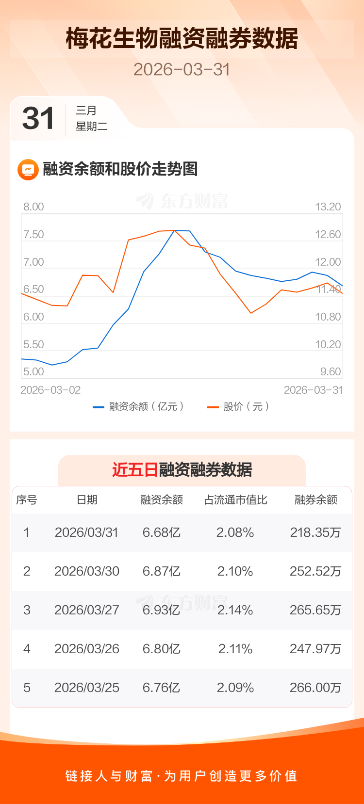 交易所最新数据显示,梅花生物于2026年3月31日获融资买入1704.46万元,融资偿还3621.96万元,当日融资净偿还1917.5万元。目前,该股融资余额6.68亿,占流通市值比例为2.08%。