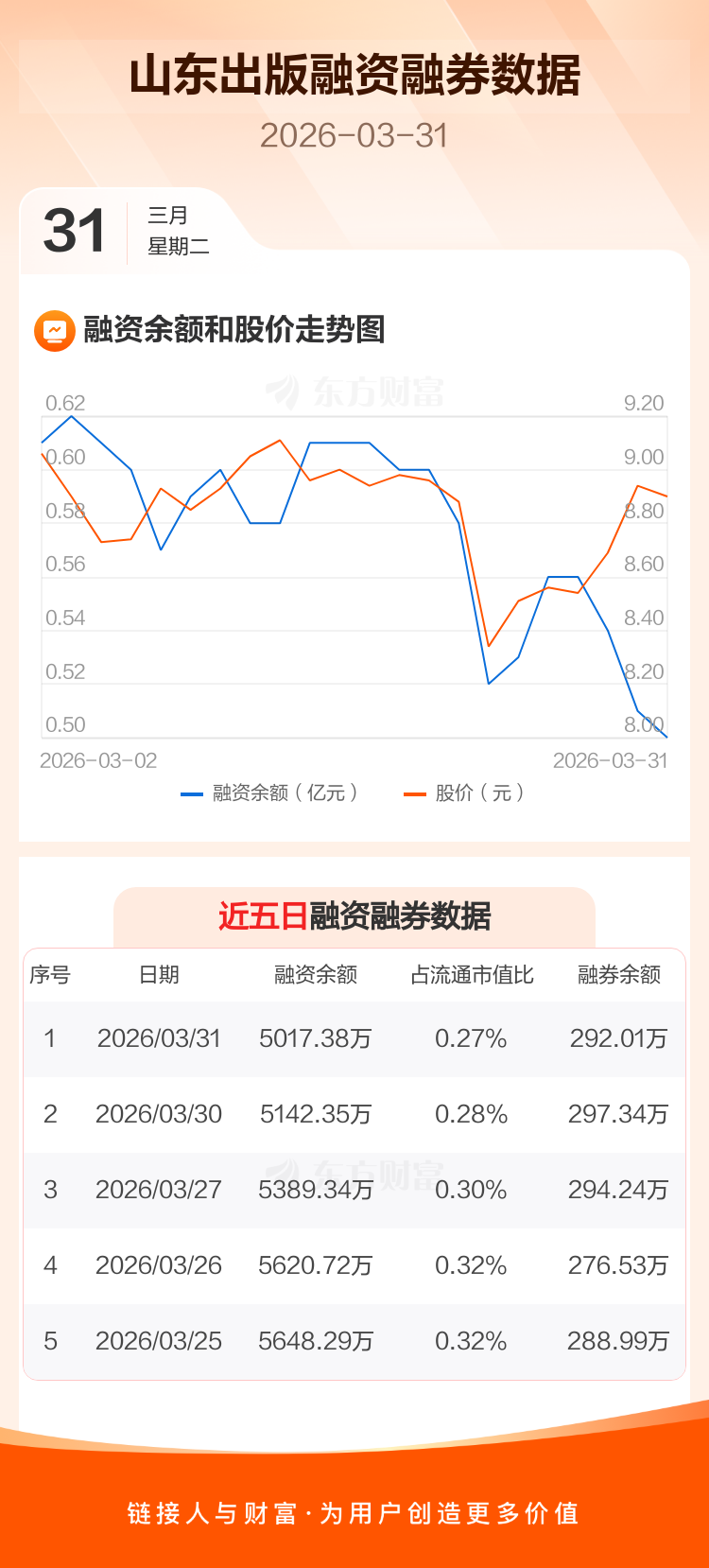 交易所最新数据显示,山东出版于2026年3月31日获融资买入222.48万元,融资偿还347.45万元,当日融资净偿还124.96万元。目前,该股融资余额5017.38万,占流通市值比例为0.27%。