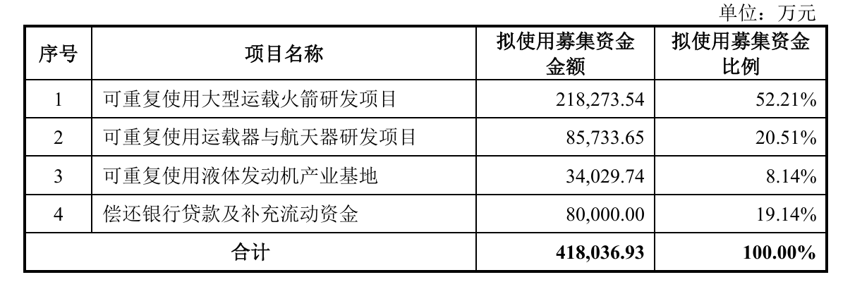 本次IPO,中科宇航计划发行募资 41.8 亿元,募集资金将投向可重复使用大型运载火箭研发、可重复使用运载器与航天器研发、可重复使用液体发动机产业基地建设,以及偿还银行贷款及补充流动资金。