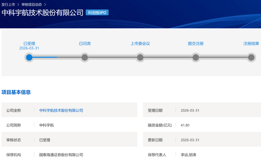 发射成功的余热未消,资本市场的好消息接踵而至。3月31日,上海证券交易所官网显示,中科宇航技术股份有限公司(下称“中科宇航”)科创板IPO状态正式变更为“已受理”,保荐机构为国泰海通。