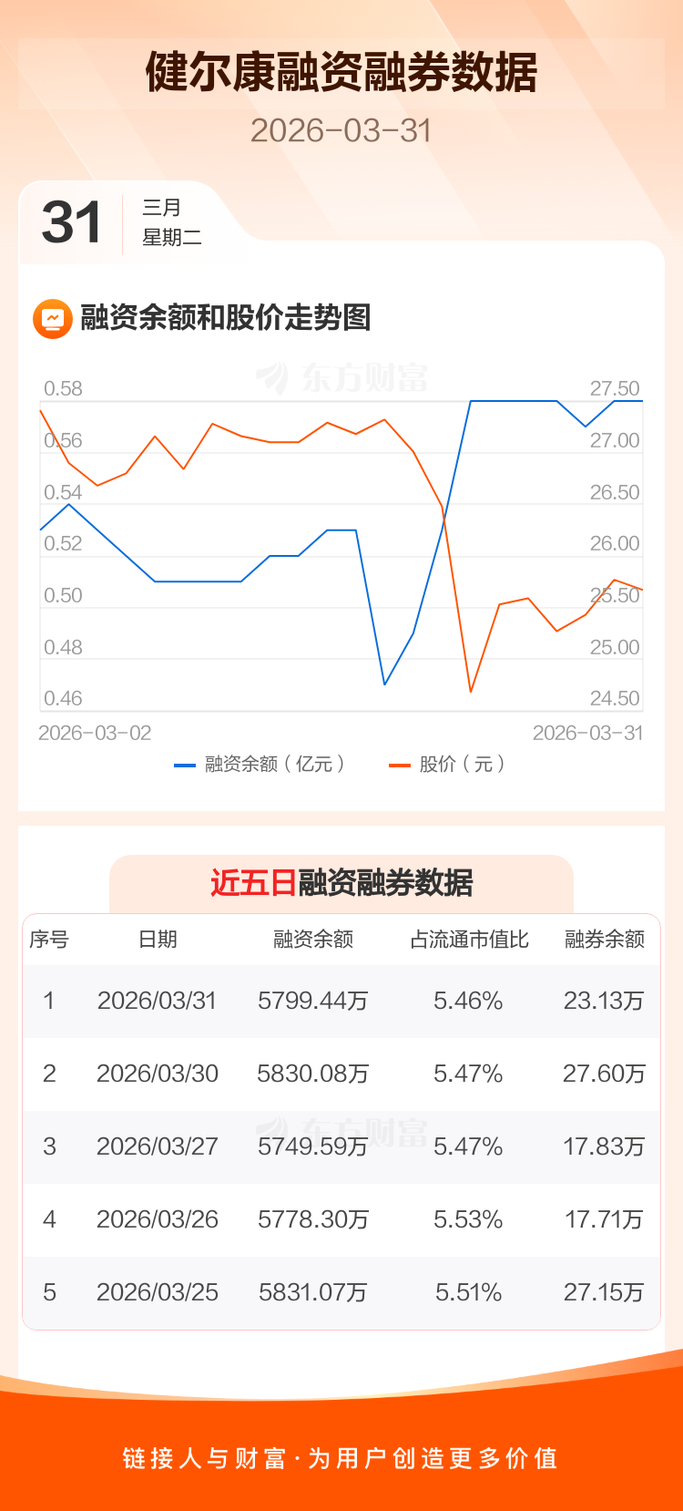 交易所最新数据显示,健尔康于2026年3月31日获融资买入147.64万元,融资偿还178.29万元,当日融资净偿还30.65万元。目前,该股融资余额5799.44万,占流通市值比例为5.46%。