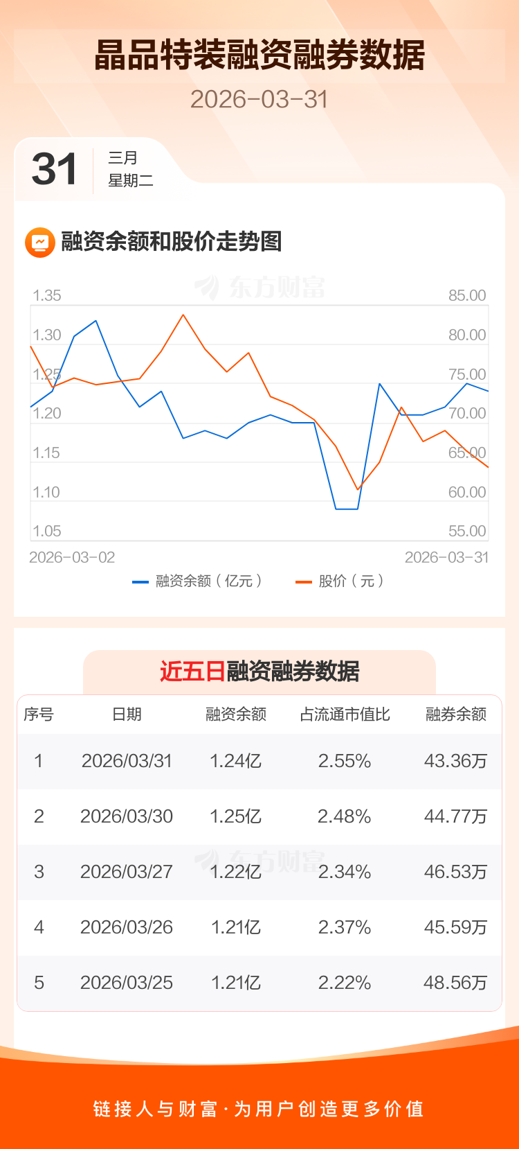 交易所最新数据显示,晶品特装于2026年3月31日获融资买入945.85万元,融资偿还1032.16万元,当日融资净偿还86.3万元。目前,该股融资余额1.24亿,占流通市值比例为2.55%。