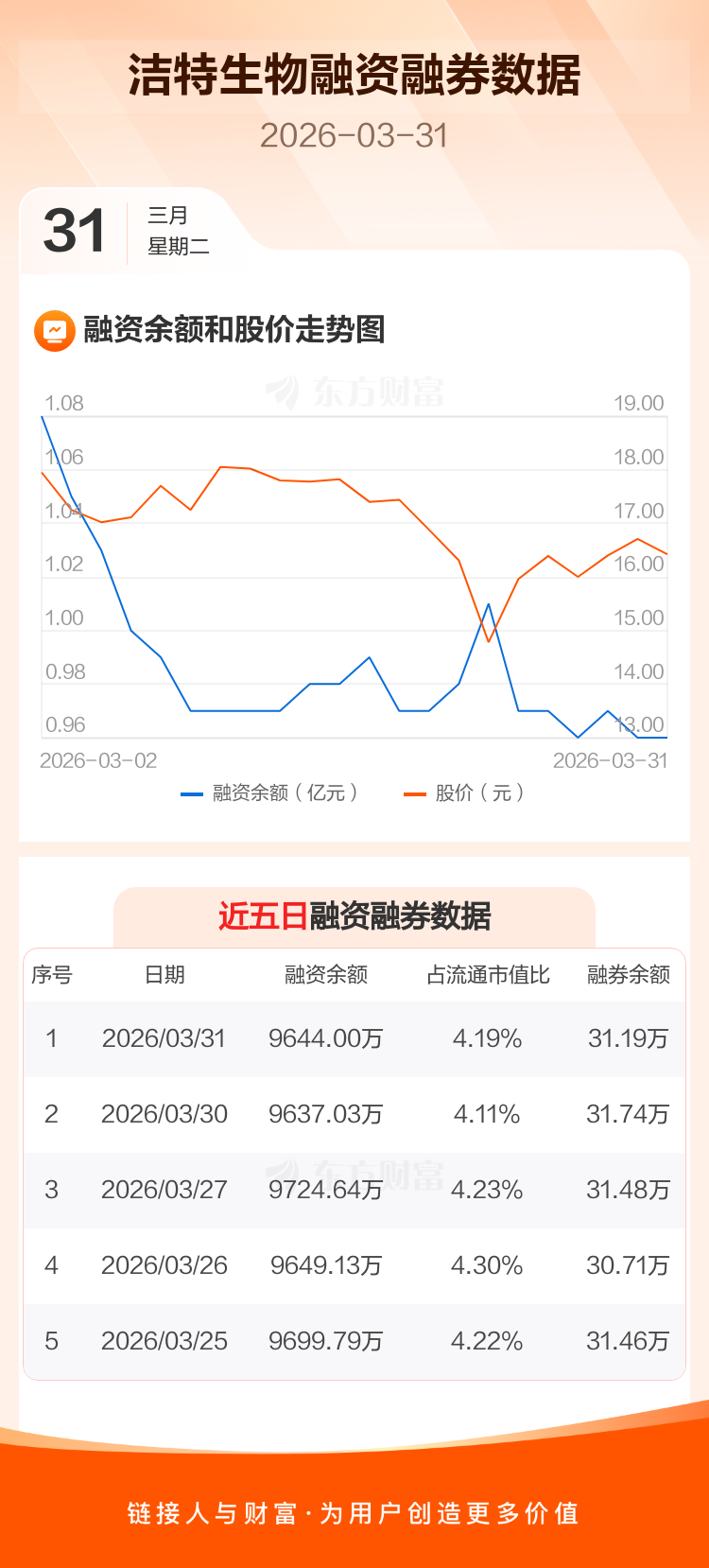 交易所最新数据显示,洁特生物于2026年3月31日获融资买入213.01万元,融资偿还206.04万元,当日融资净买入6.97万元。目前,该股融资余额9644.00万,占流通市值比例为4.19%。