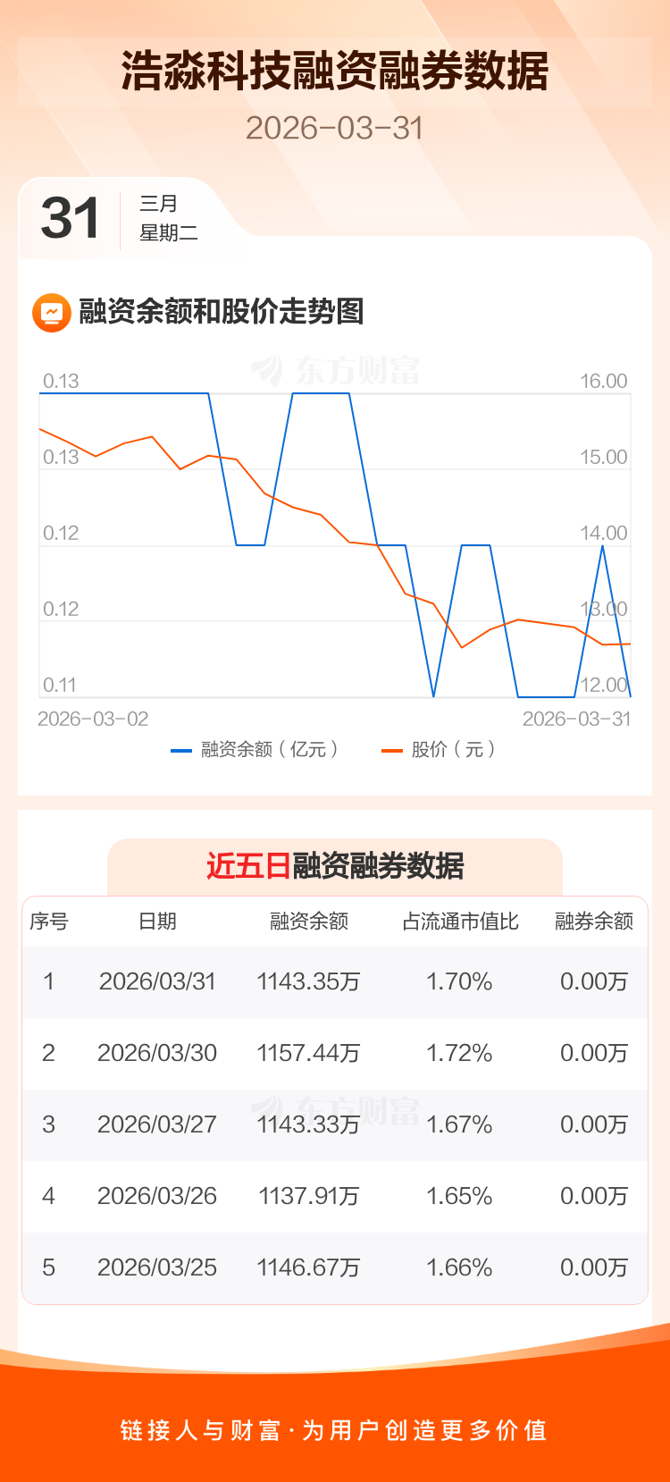 交易所最新数据显示,浩淼科技于2026年3月31日获融资买入16.82万元,融资偿还30.90万元,当日融资净偿还14.08万元。目前,该股融资余额1143.35万,占流通市值比例为1.70%。