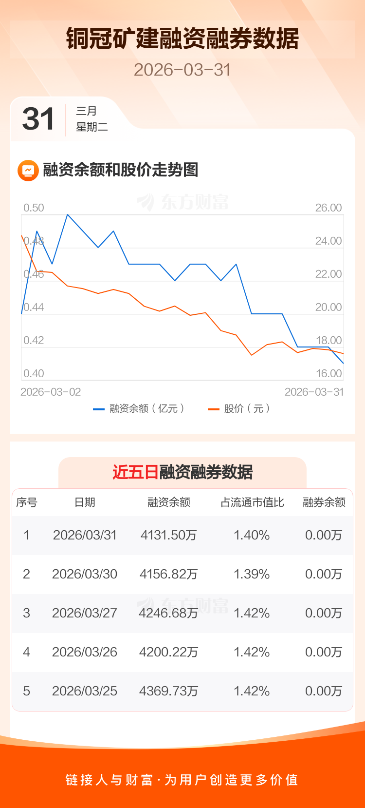 交易所最新数据显示,铜冠矿建于2026年3月31日获融资买入105.81万元,融资偿还131.13万元,当日融资净偿还25.32万元。目前,该股融资余额4131.50万,占流通市值比例为1.40%。