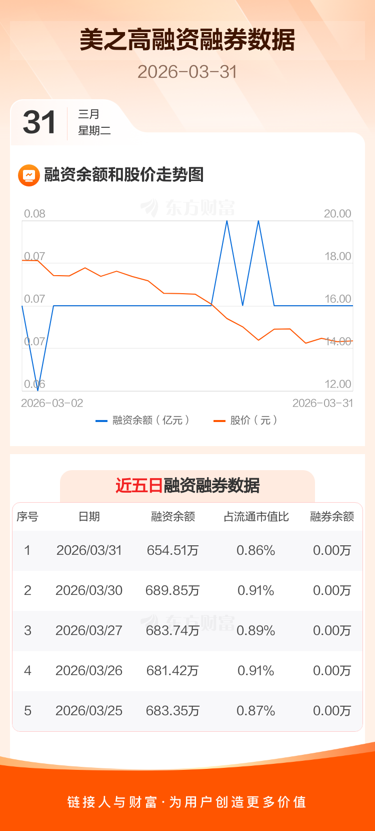 交易所最新数据显示,美之高于2026年3月31日获融资买入47.35万元,融资偿还82.69万元,当日融资净偿还35.34万元。目前,该股融资余额654.51万,占流通市值比例为0.86%。
