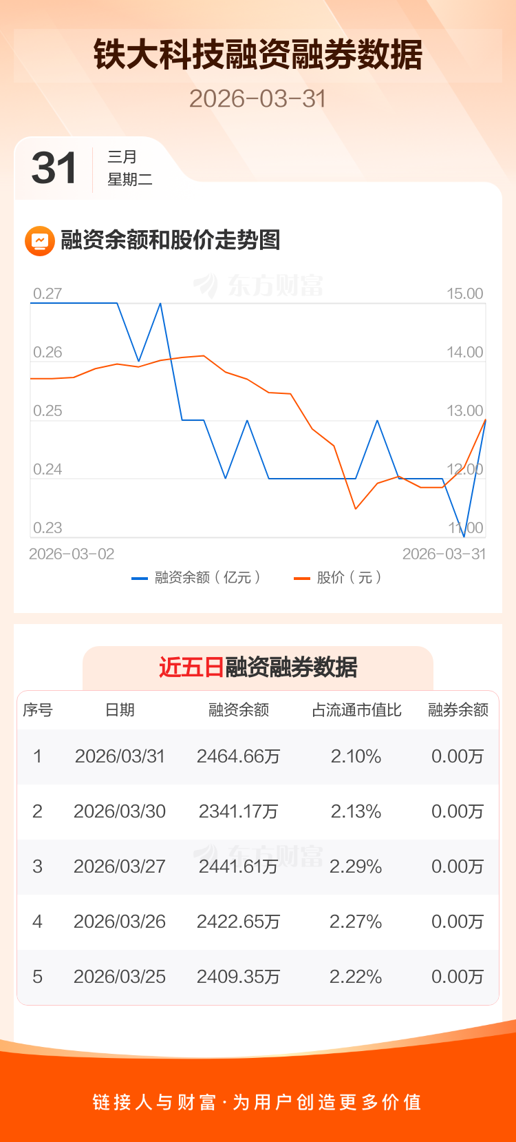 交易所最新数据显示,铁大科技于2026年3月31日获融资买入366.52万元,融资偿还243.03万元,当日融资净买入123.49万元。目前,该股融资余额2464.66万,占流通市值比例为2.10%。