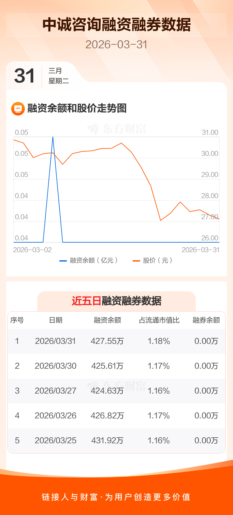 交易所最新数据显示,中诚咨询于2026年3月31日获融资买入10.58万元,融资偿还8.63万元,当日融资净买入1.94万元。目前,该股融资余额427.55万,占流通市值比例为1.18%。