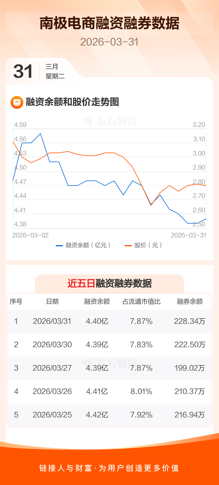 交易所最新数据显示,南极电商于2026年3月31日获融资买入498.90万元,融资偿还412.42万元,当日融资净买入86.48万元。目前,该股融资余额4.40亿,占流通市值比例为7.87%。