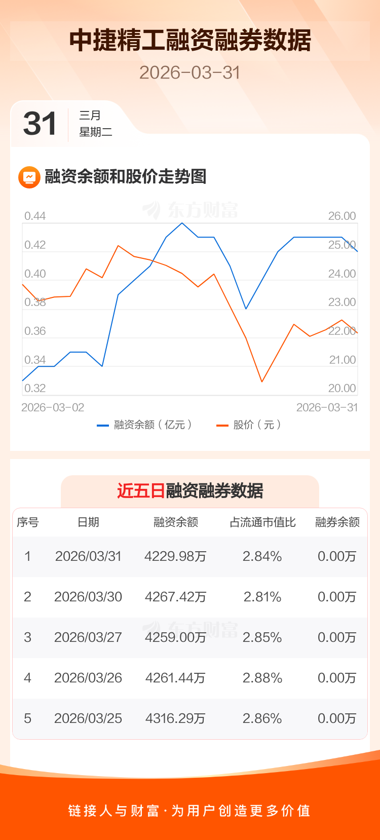 交易所最新数据显示,中捷精工于2026年3月31日获融资买入298.31万元,融资偿还335.75万元,当日融资净偿还37.44万元。目前,该股融资余额4229.98万,占流通市值比例为2.84%。