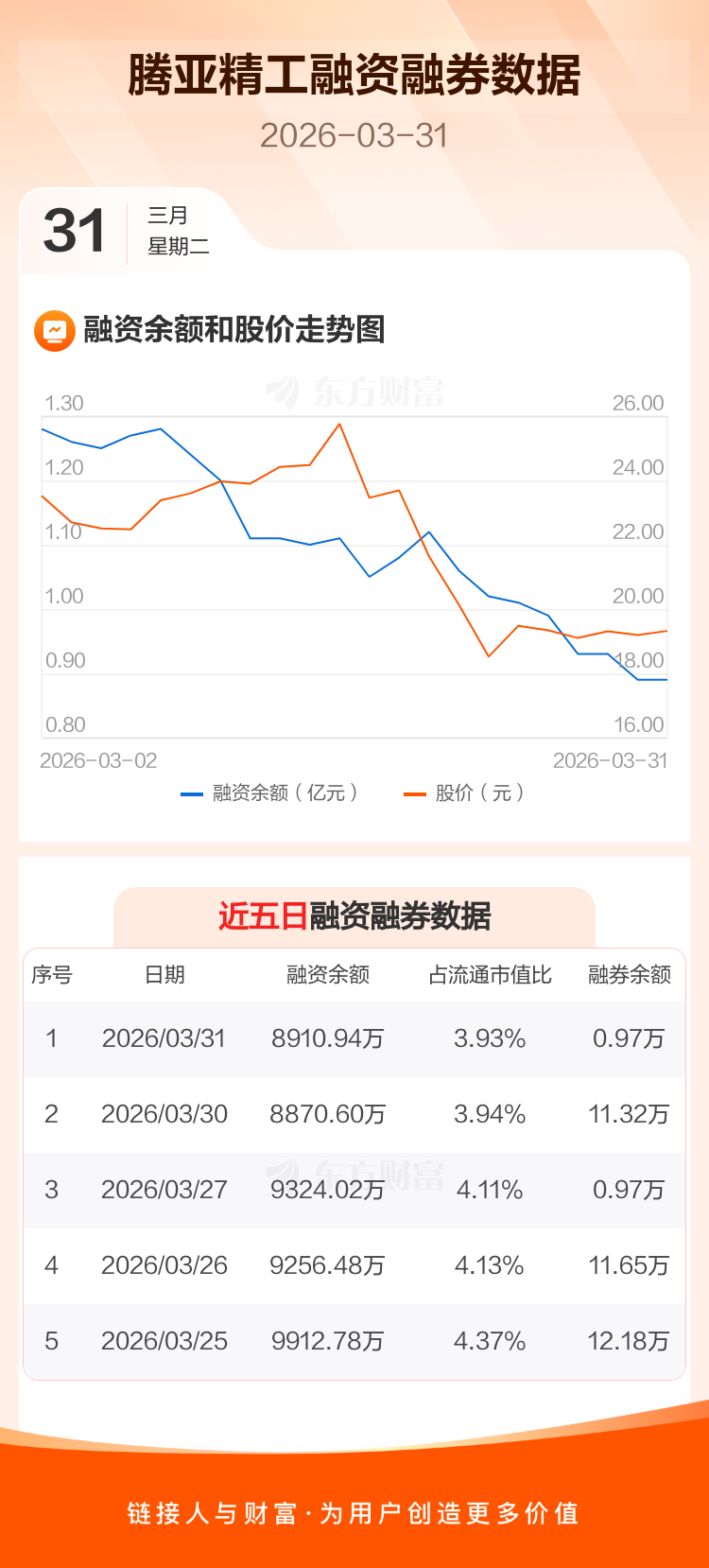 交易所最新数据显示,腾亚精工于2026年3月31日获融资买入858.53万元,融资偿还818.19万元,当日融资净买入40.34万元。目前,该股融资余额8910.94万,占流通市值比例为3.93%。