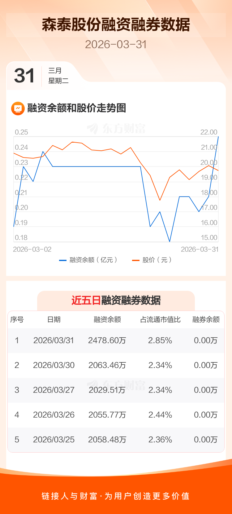 交易所最新数据显示,森泰股份于2026年3月31日获融资买入735.03万元,融资偿还319.90万元,当日融资净买入415.13万元。目前,该股融资余额2478.60万,占流通市值比例为2.85%。