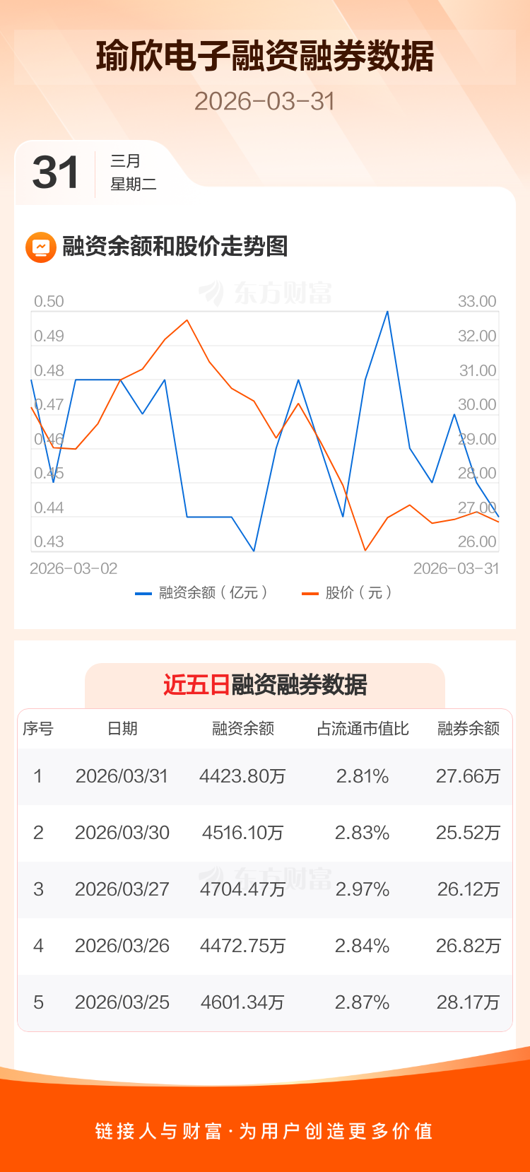 交易所最新数据显示,瑜欣电子于2026年3月31日获融资买入238.32万元,融资偿还330.62万元,当日融资净偿还92.29万元。目前,该股融资余额4423.80万,占流通市值比例为2.81%。