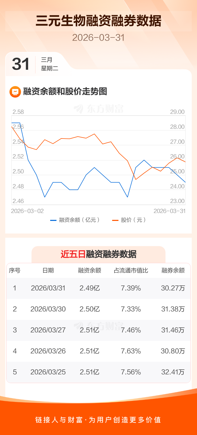 交易所最新数据显示,三元生物于2026年3月31日获融资买入151.75万元,融资偿还210.44万元,当日融资净偿还58.69万元。目前,该股融资余额2.49亿,占流通市值比例为7.39%。