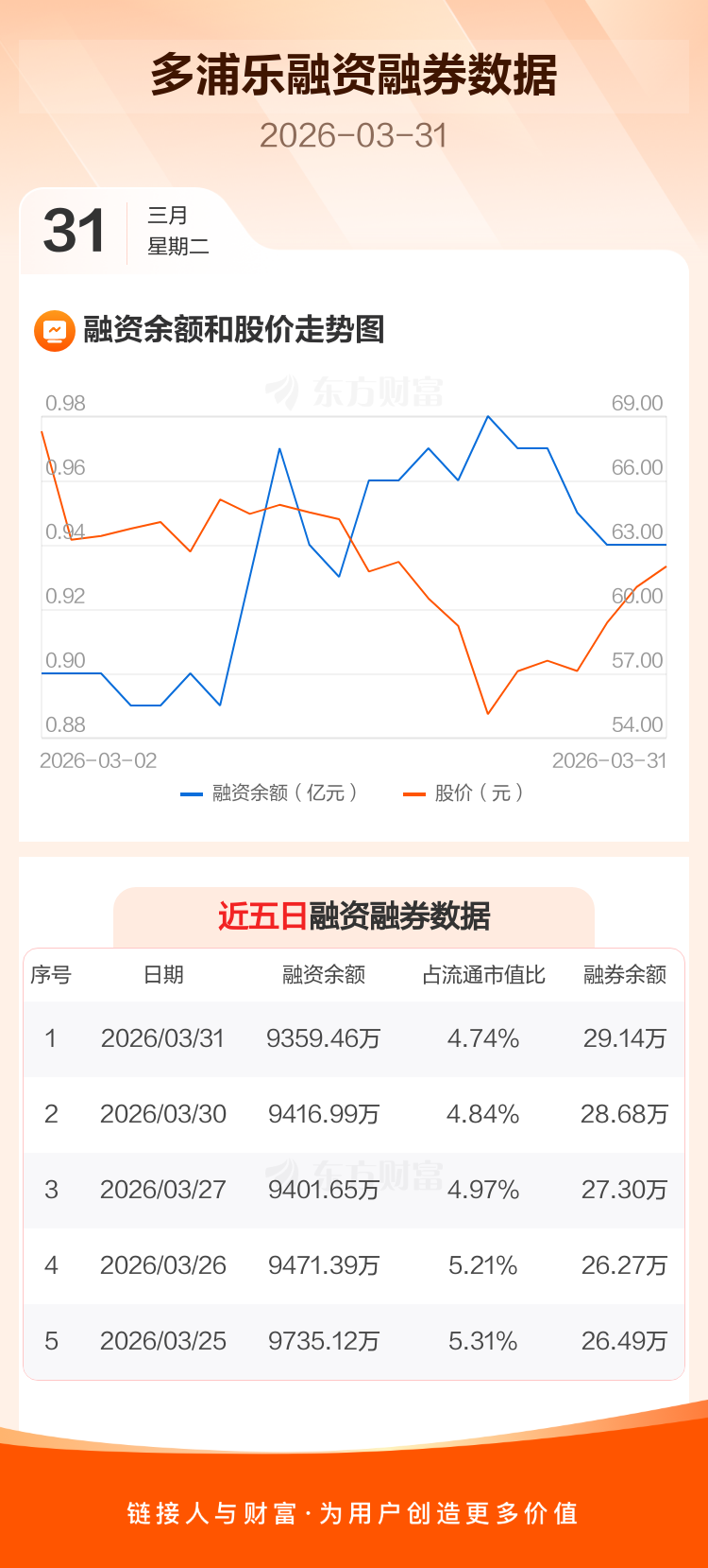 交易所最新数据显示,多浦乐于2026年3月31日获融资买入366.93万元,融资偿还424.46万元,当日融资净偿还57.53万元。目前,该股融资余额9359.46万,占流通市值比例为4.74%。