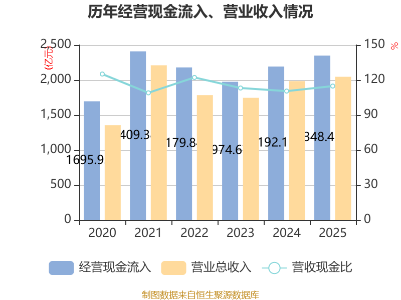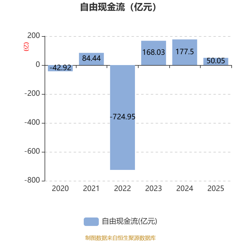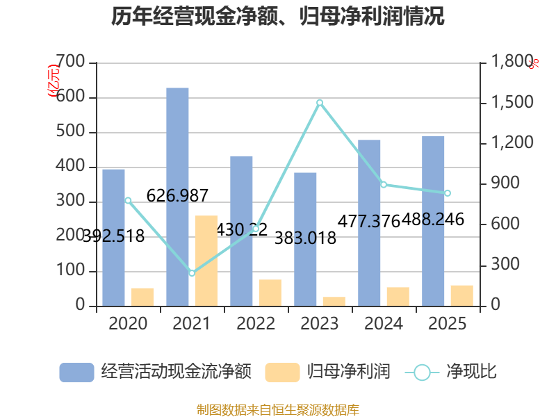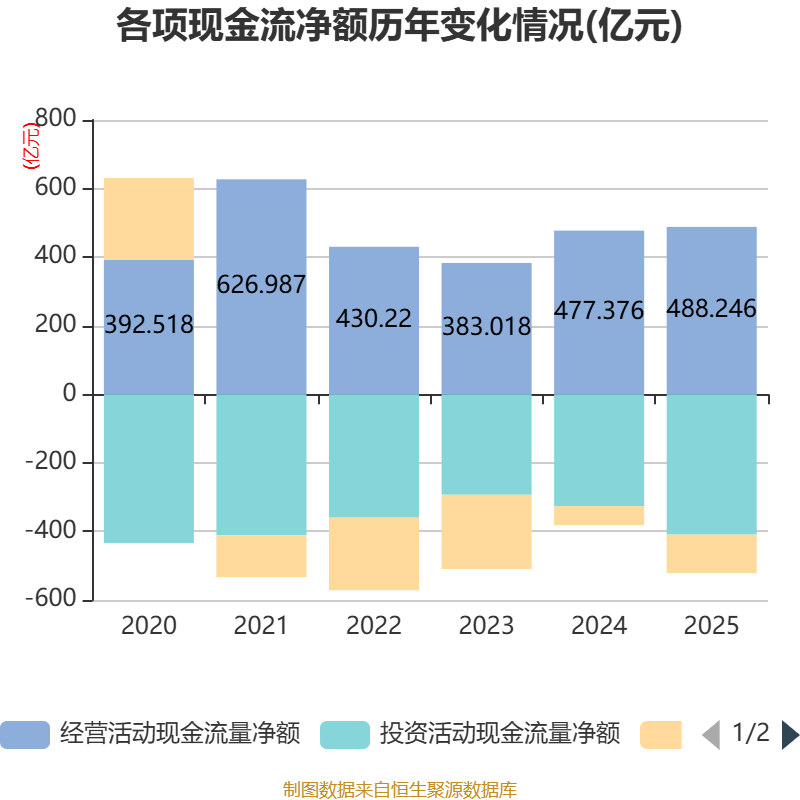 截至2025年,公司经营活动现金流净额为488.25亿元,同比增长2.28%;筹资活动现金流净额-112.25亿元,同比减少57.08亿元;投资活动现金流净额-409.28亿元,上年同期为-326.5亿元。