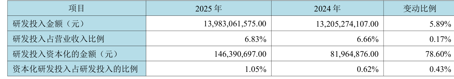 2025年全年,公司研发投入金额为139.83亿元,同比增长5.89%;研发投入占营业收入比例为6.83%,相比上年同期上升0.17个百分点。此外,公司全年研发投入资本化率为1.05%。