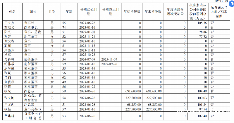 高管薪酬方面,公司董监高薪酬整体保持稳定。董事长王文杰报告期内税前报酬为105.76万元;总裁阳杰税前报酬为78.86万元;副总裁杨光、张文河、王文想税前报酬分别为104.49万元、100.03万元、101.34万元;首席财务官丛述峰税前报酬102.40万元。