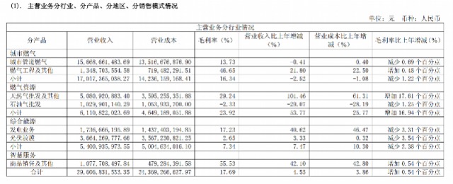 分业务板块来看,燃气资源板块成为营收增长核心驱动力,天然气批发及其他业务实现收入50.81亿元,同比大幅增长101.46%;综合能源板块依托发电业务快速扩张,收入达17.37亿元,同比增长40.62%;城市燃气板块运营平稳,实现收入170.17亿元,其中管道燃气收入156.69亿元;受“瓶改管”工程收尾影响,智慧服务板块收入12.72亿元,同比下降32.75%。