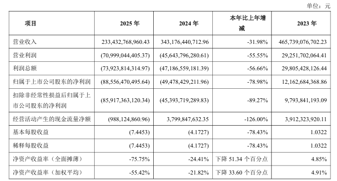 3月31日晚间,万科披露了2025年年度报告。财报显示,公司全年营业收入2334.3亿元,同比下滑32.0%;归母净利润-885.6亿元,亏损额同比扩大78.98%;合同销售金额1340.6亿元,同比下降45.5%;全年完成超11.7万套房屋的交付工作。