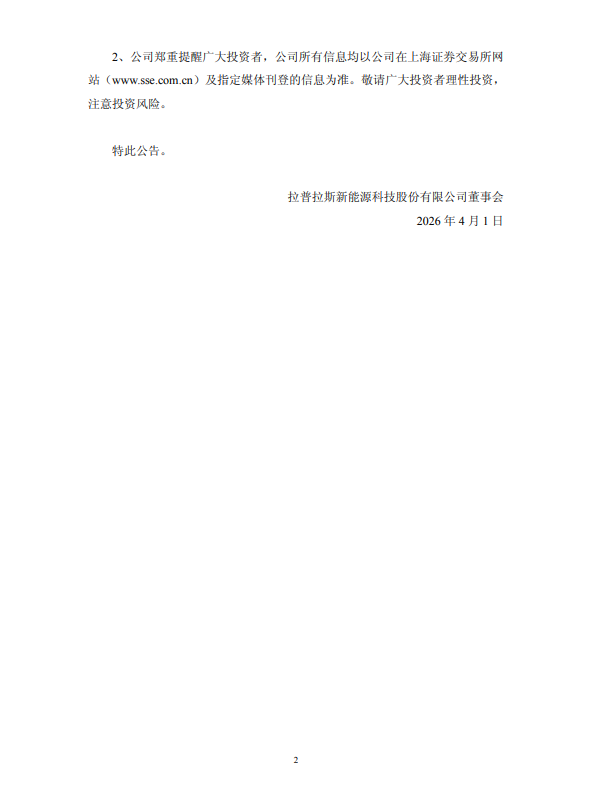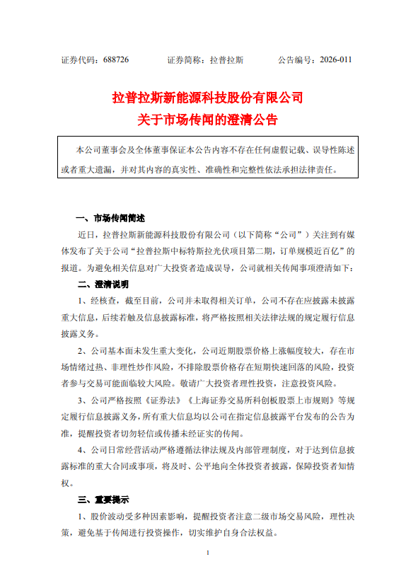拉普拉斯发布澄清公告,近日,公司关注到有媒体发布了关于公司“拉普拉斯中标特斯拉光伏项目第二期,订单规模近百亿”的报道。为避免相关信息对广大投资者造成误导,公司就相关传闻事项澄清如下:经核查,截至目前,公司并未取得相关订单,公司不存在应披露未披露重大信息,后续若触及信息披露标准,将严格按照相关法律法规的规定履行信息披露义务。