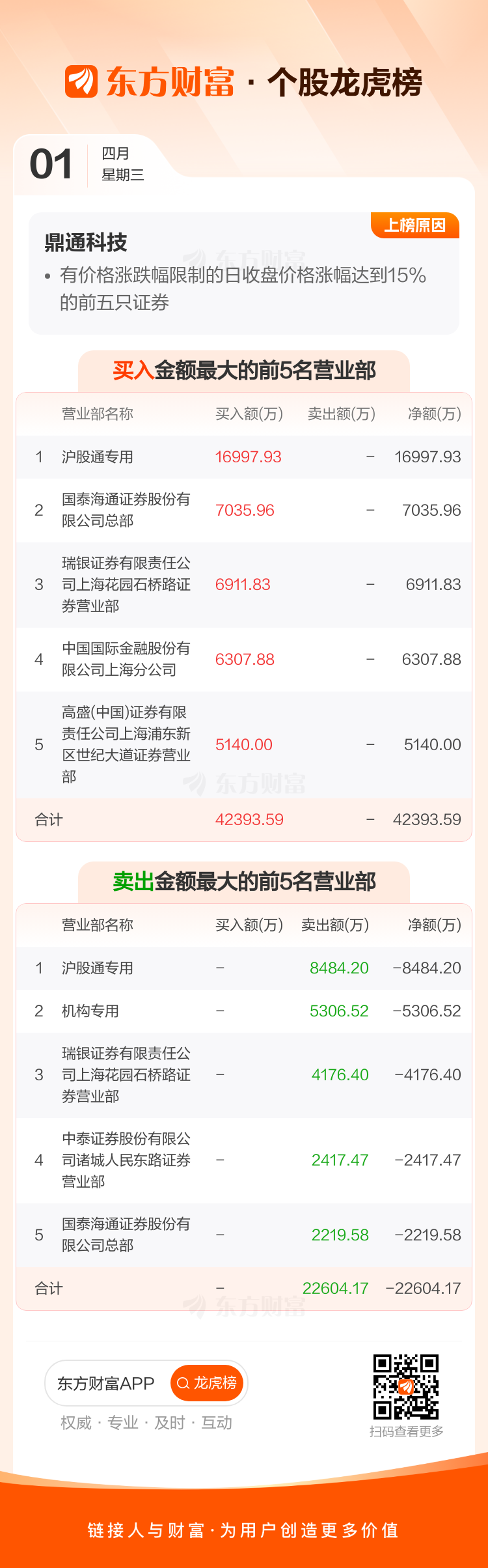 交易所2026年4月1日公布的交易公开信息显示,鼎通科技因成为有价格涨跌幅限制的日收盘价格涨幅达到15%的前五只证券上榜。鼎通科技当日收报149.19元,涨跌幅18.50%,偏离值18.50%,换手率9.41%,成交额18.53亿。