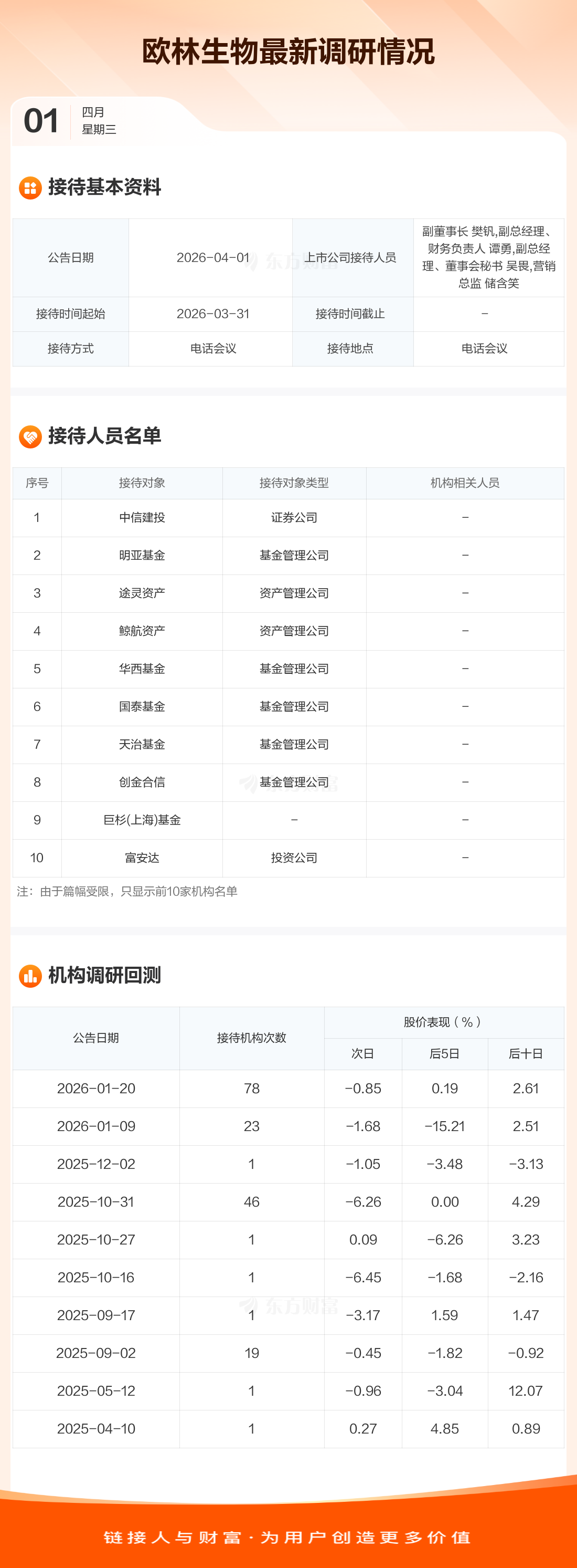 欧林生物4月1日公告称,3月31日接待中信建投等42家机构调研。接待人员包括副董事长 樊钒,副总经理、财务负责人 谭勇,副总经理、董事会秘书 吴畏,营销总监 储含笑。