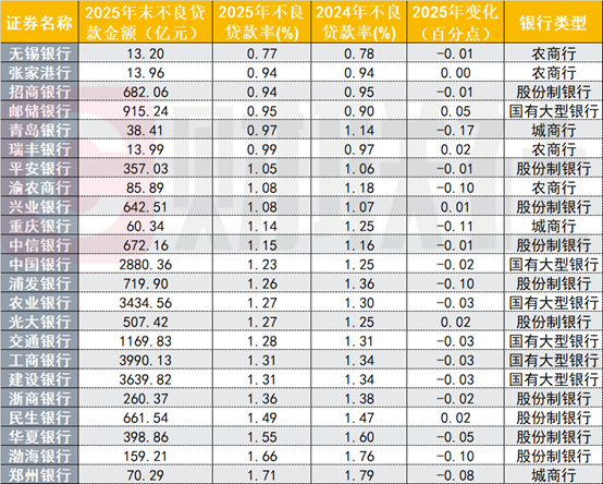 图:上市银行2025年不良贷款率及变化