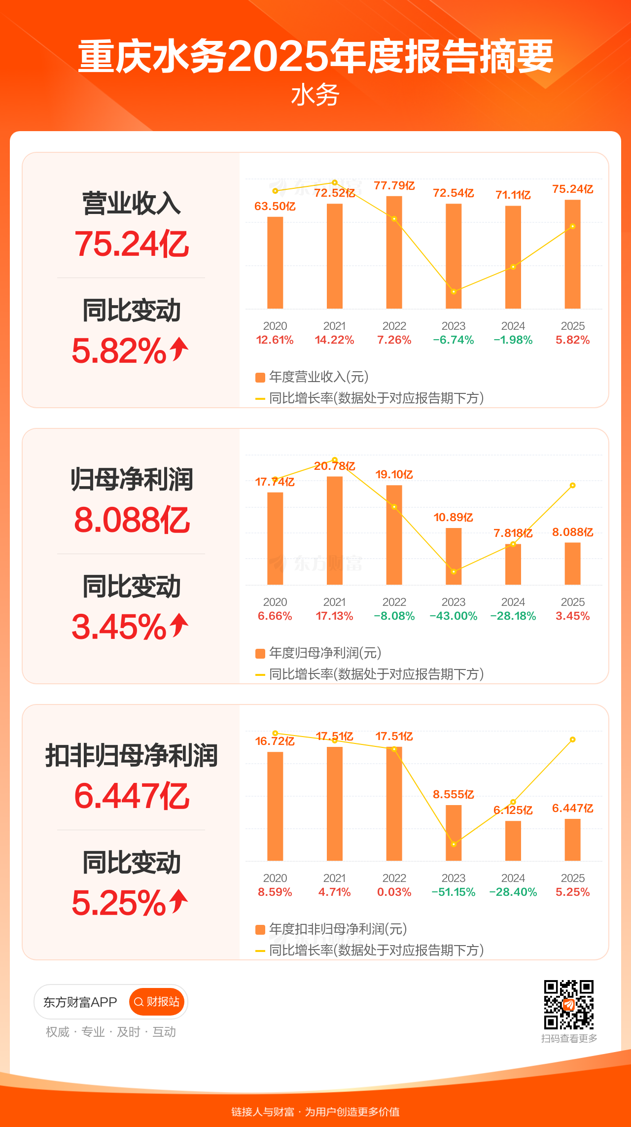 重庆水务4月2日发布2025年年报显示,公司全年实现营业收入75.24亿元,同比增长5.82%;归母净利润8.09亿元,同比增长3.45%;扣非归母净利润6.45亿元,同比增长5.25%。