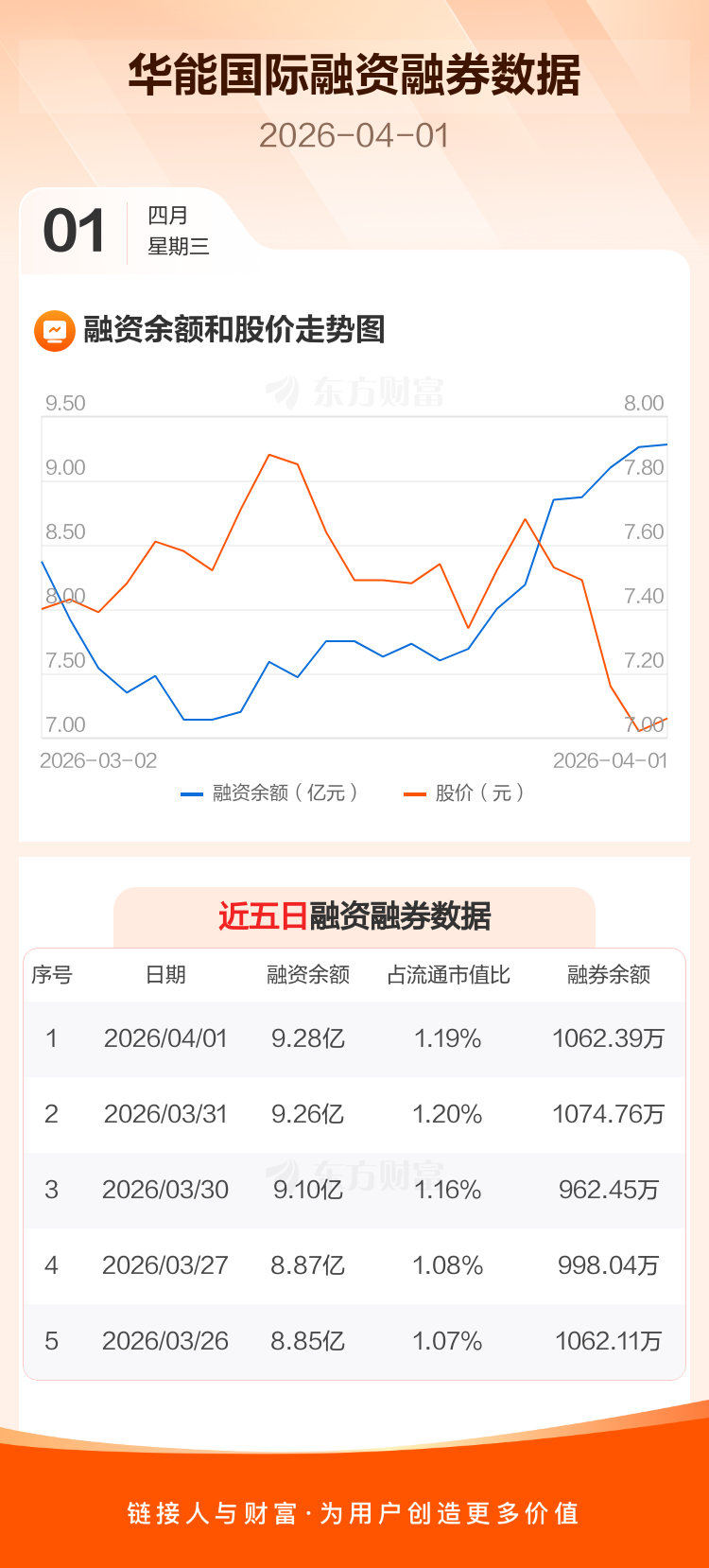 交易所最新数据显示,华能国际于2026年4月1日获融资买入5617.69万元,融资偿还5428.43万元,当日融资净买入189.26万元。目前,该股融资余额9.28亿,占流通市值比例为1.19%。