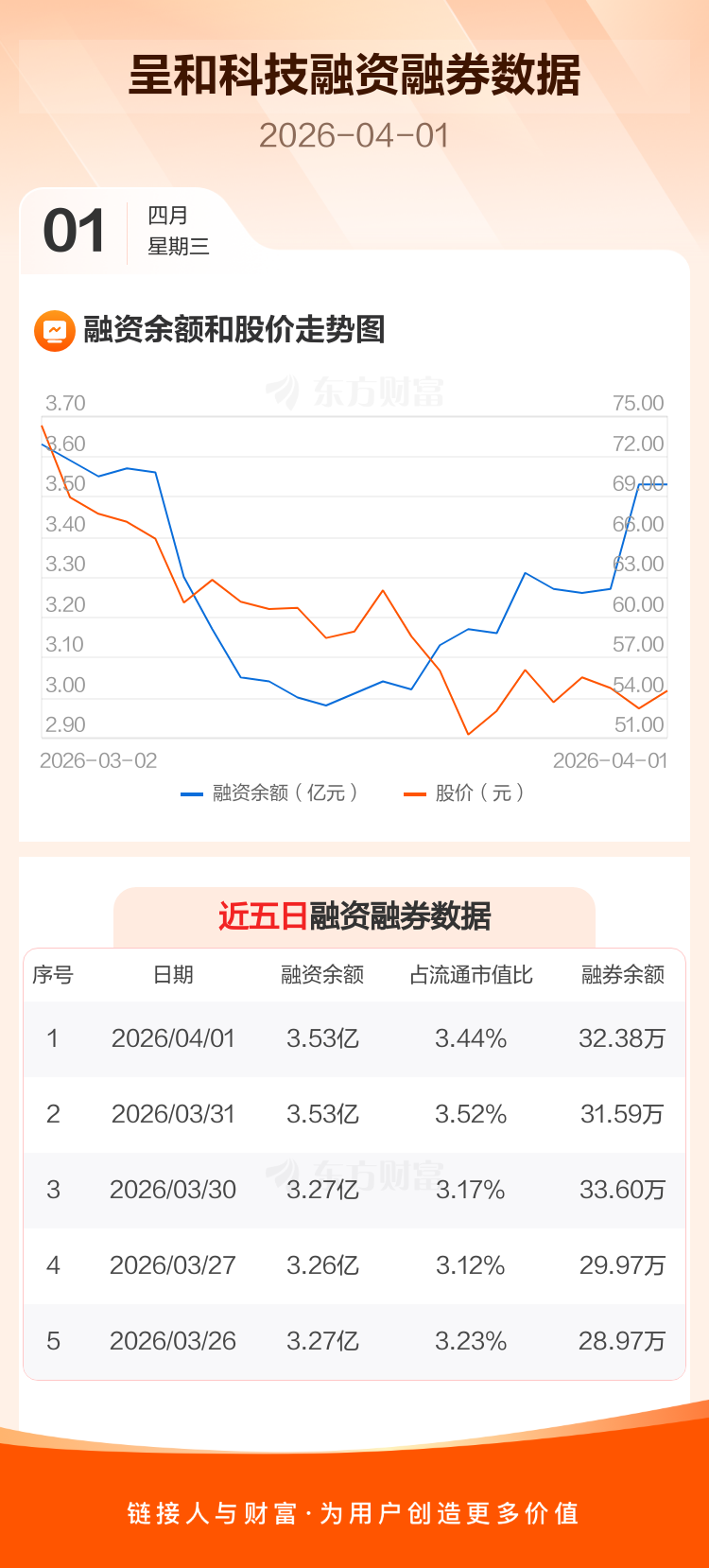 交易所最新数据显示,呈和科技于2026年4月1日获融资买入569.35万元,融资偿还541.44万元,当日融资净买入27.91万元。目前,该股融资余额3.53亿,占流通市值比例为3.44%。