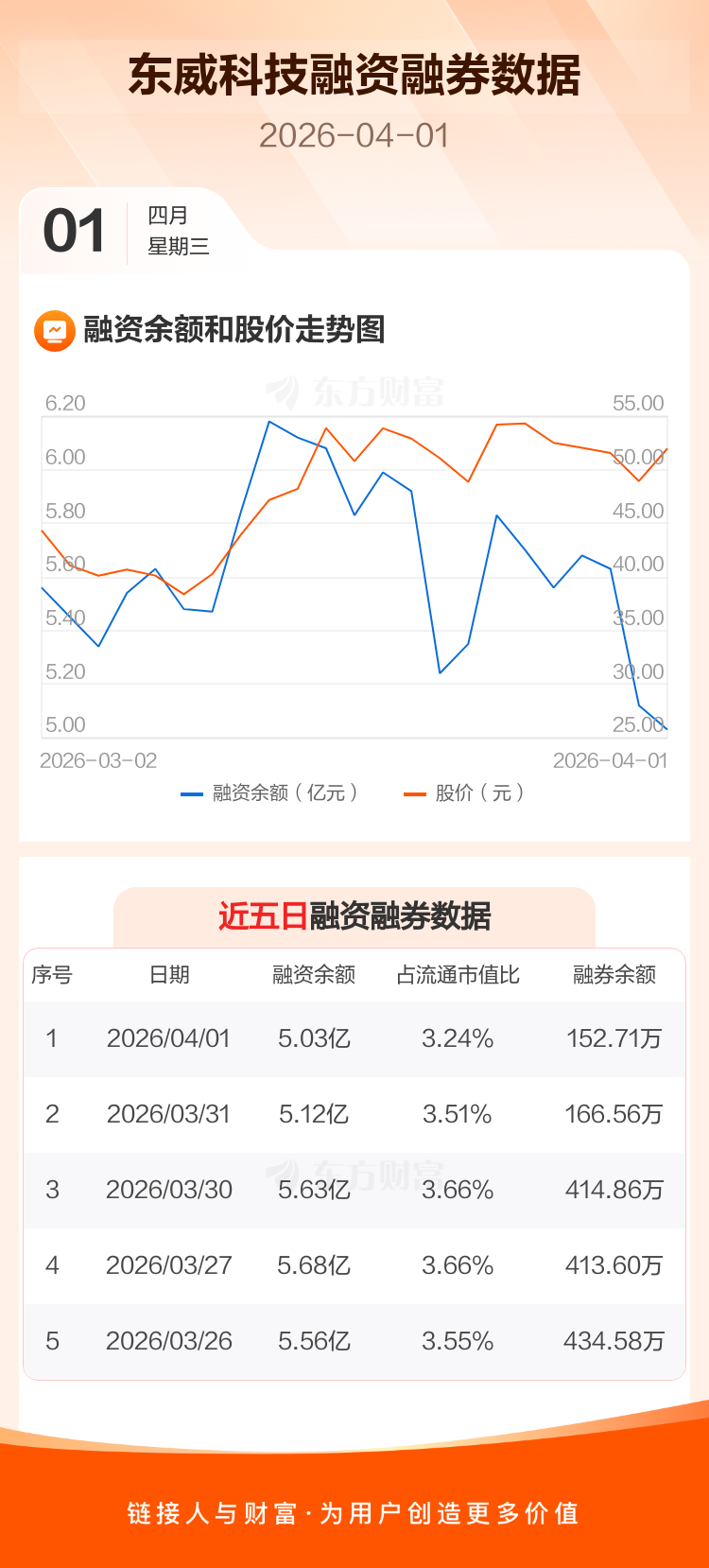 交易所最新数据显示,东威科技于2026年4月1日获融资买入7050.72万元,融资偿还7936.17万元,当日融资净偿还885.44万元。目前,该股融资余额5.03亿,占流通市值比例为3.24%。