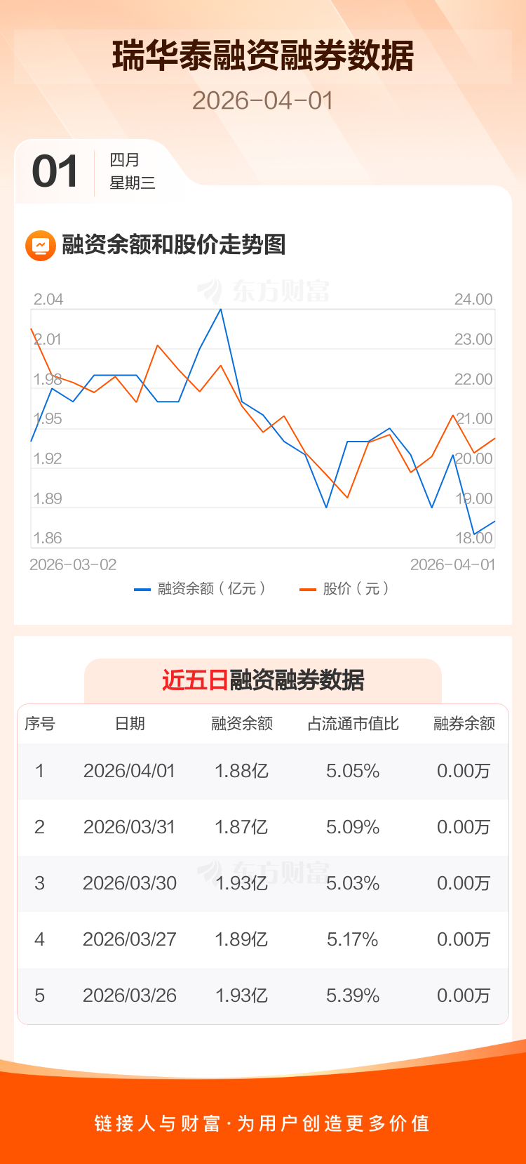 交易所最新数据显示,瑞华泰于2026年4月1日获融资买入1178.80万元,融资偿还1005.72万元,当日融资净买入173.07万元。目前,该股融资余额1.88亿,占流通市值比例为5.05%。