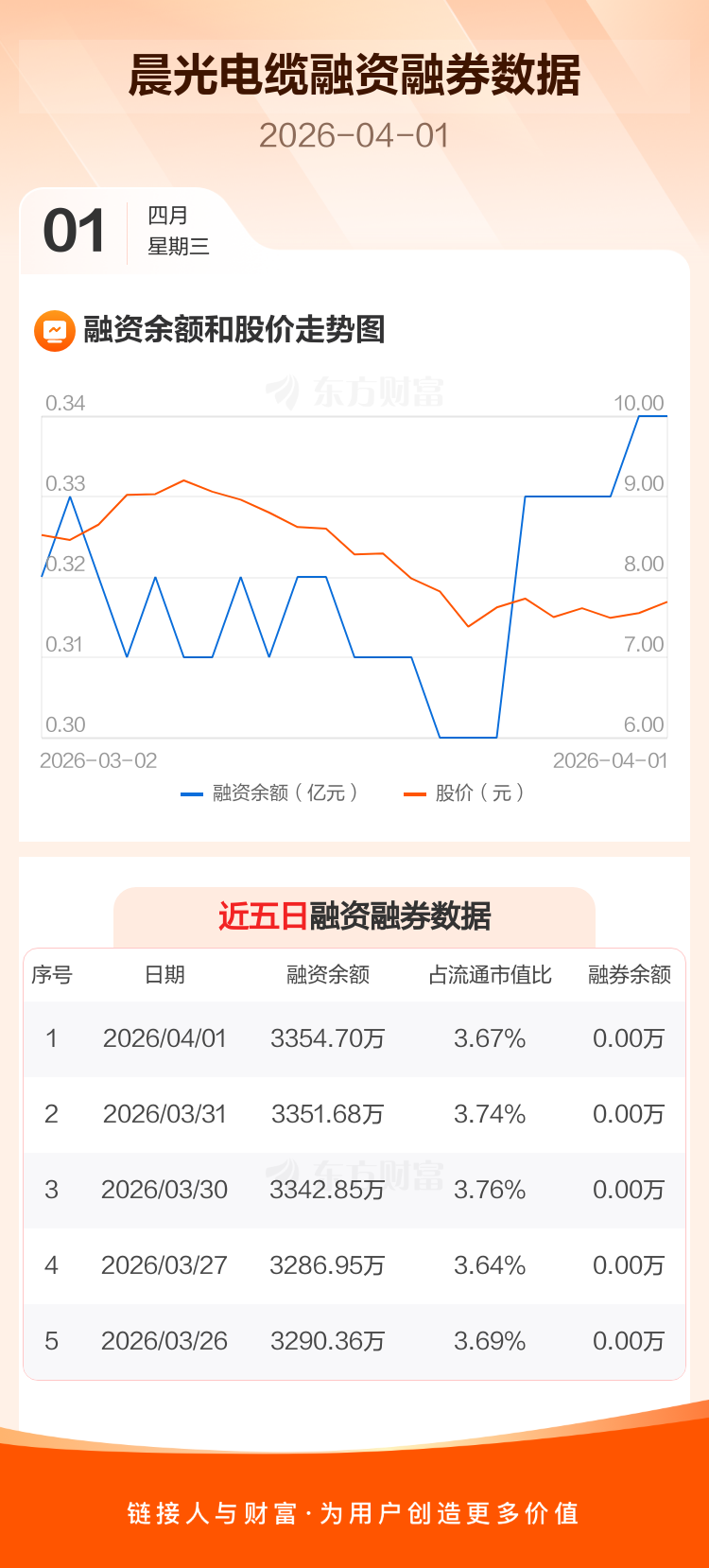 交易所最新数据显示,晨光电缆于2026年4月1日获融资买入34.08万元,融资偿还31.06万元,当日融资净买入3.02万元。目前,该股融资余额3354.70万,占流通市值比例为3.67%。