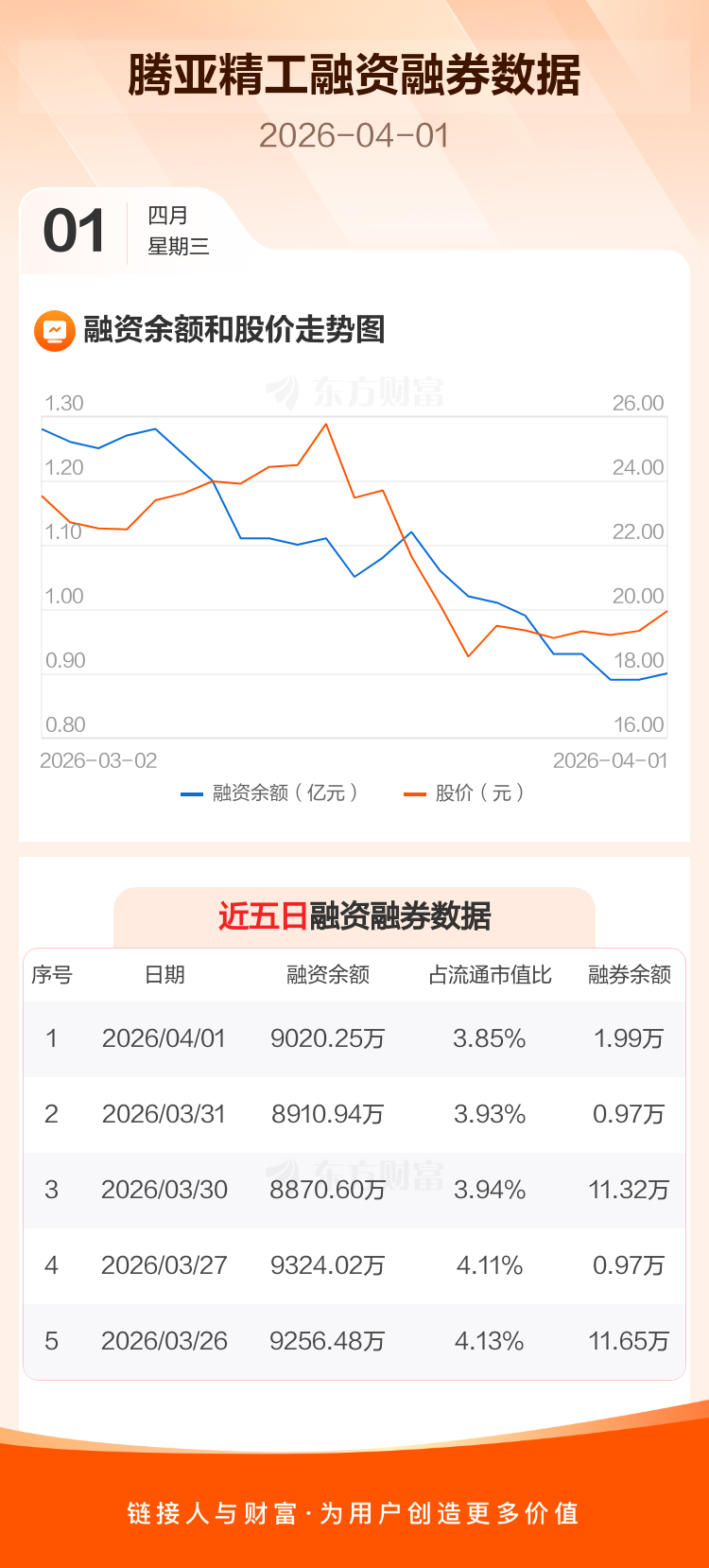 交易所最新数据显示,腾亚精工于2026年4月1日获融资买入478.35万元,融资偿还369.05万元,当日融资净买入109.31万元。目前,该股融资余额9020.25万,占流通市值比例为3.85%。