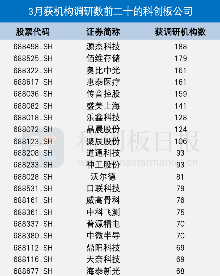 《科创板日报》4月2日讯(记者黄修眉)3月1日至31日,共111家科创板公司获得机构调研,其中获超百家调研机构的科创板公司有9家;从细分行业来看,半导体、医疗器械、通用设备、专用设备为最受关注的五大领域。