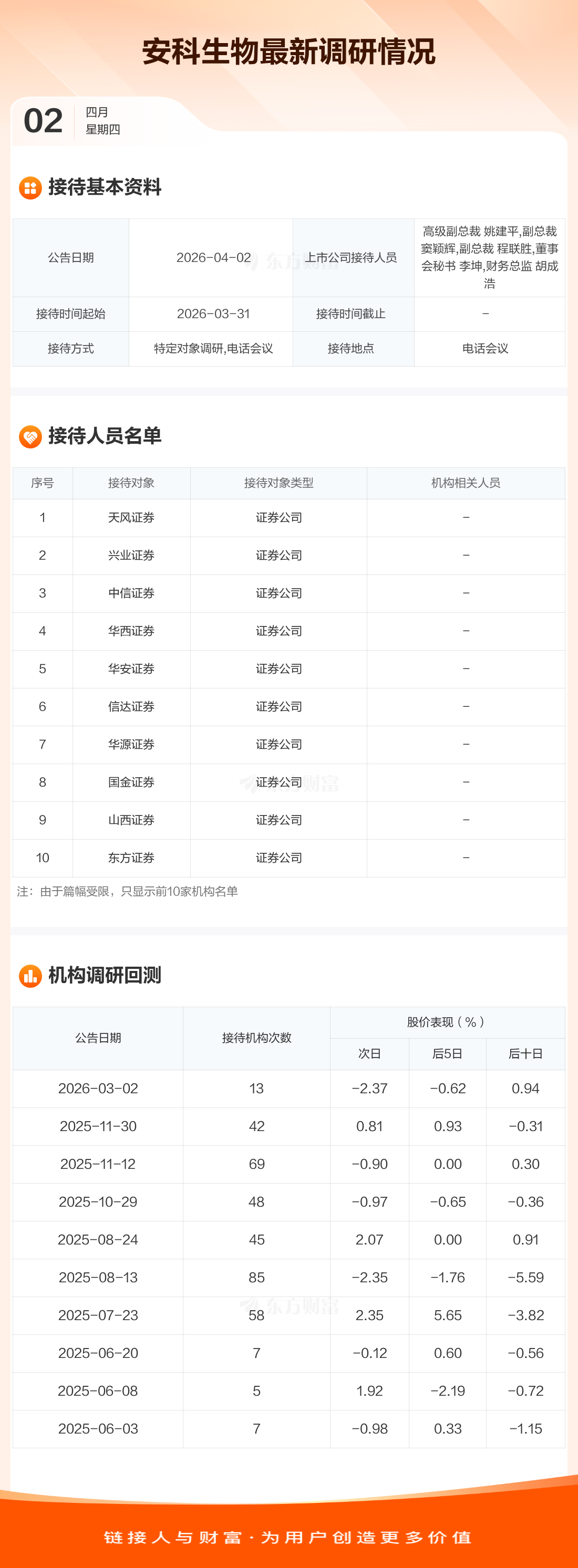 安科生物4月2日公告称,3月31日接待天风证券等30家机构调研。接待人员包括高级副总裁 姚建平,副总裁 窦颖辉,副总裁 程联胜,董事会秘书 李坤,财务总监 胡成浩。