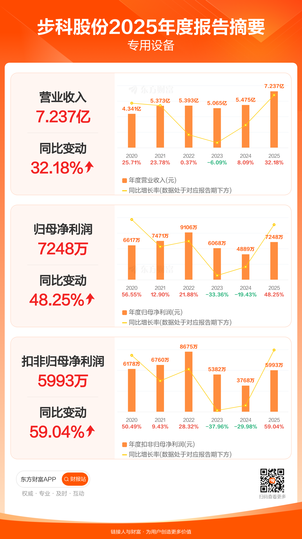 步科股份4月3日发布2025年年报显示,公司全年实现营业收入7.24亿元,同比增长32.18%;归母净利润7248.10万元,同比增长48.25%;扣非归母净利润5993.18万元,同比增长59.04%。
